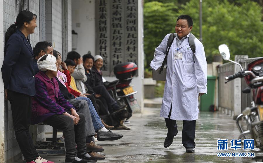 5月28日,何永清(右)一大早出門“送醫(yī)上門”后回到村衛(wèi)生室時,門口排滿了等待就診的村民。何永清是陜西省略陽縣樂素河鎮(zhèn)瓦房村衛(wèi)生室的一名村醫(yī),幼年時因車禍?zhǔn)ビ冶邸?006年7月從漢中市衛(wèi)校畢業(yè)后,他選擇回到山大溝深的秦嶺腹地故鄉(xiāng)工作。十多年來,何永清堅守在基層衛(wèi)生第一線,鄉(xiāng)親們親切地稱他為“我們的獨臂村醫(yī)”。新華社記者陶明攝