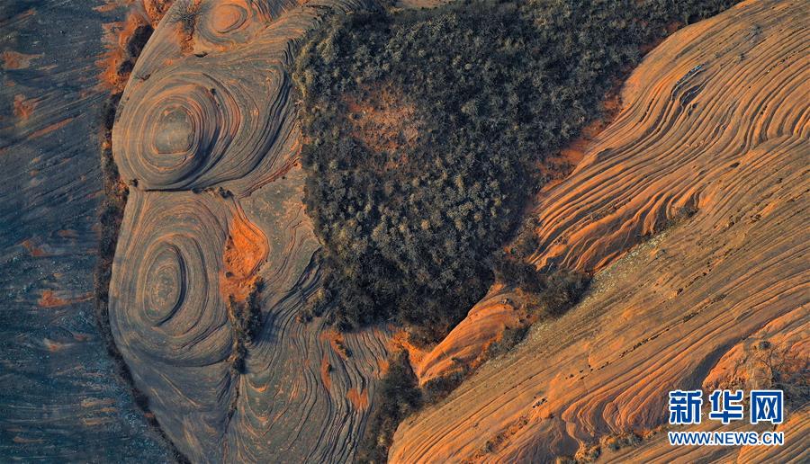 這是12月16日無人機拍攝的陜西省志丹縣杏河鎮(zhèn)丹霞地貌“螺旋谷”。 在陜西省延安市志丹縣杏河鎮(zhèn)有一片美麗的丹霞地貌,這里山巒起伏,溝壑縱橫,一些紅砂石呈現(xiàn)出大小不同的螺旋狀紋理,讓人嘆為觀止。 新華社記者陶明攝