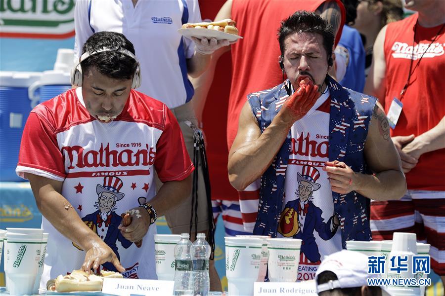 2019年7月4日,在美國紐約康尼島,選手參加一年一度的吃熱狗大賽。 新華社記者 李木子 攝
