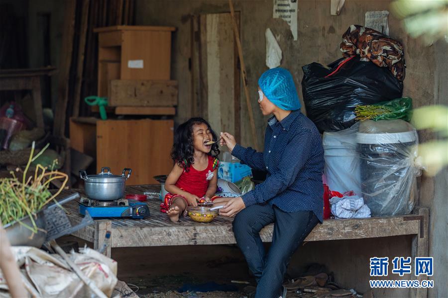 2019年3月15日,在柬埔寨磅湛,接受了白內(nèi)障手術(shù)的孫美樂回到住處給女兒喂飯。今年36歲的孫美樂是一位經(jīng)濟貧困的單身母親,和小女兒租住在一間簡陋的小屋里。她的左眼因白內(nèi)障幾近失明,無法繼續(xù)工作。在中國醫(yī)生到磅湛開展義診期間,她接受了廣西醫(yī)科大學(xué)第一附屬醫(yī)院梁皓醫(yī)生實施的白內(nèi)障手術(shù),術(shù)后一天她的左眼即恢復(fù)視物。 新華社記者 朱煒 攝