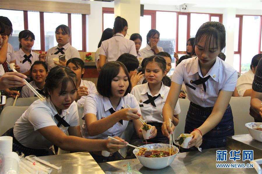2019年8月30日,在泰國孔敬大學(xué)孔子學(xué)院,學(xué)生在孔敬大學(xué)第三屆“中國廚房”美食文化節(jié)上品嘗水煮肉片。 新華社記者 楊舟 攝