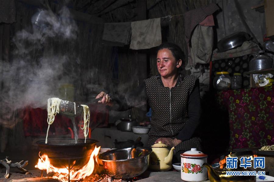 在地處塔克拉瑪干沙漠腹地的于田縣達(dá)里雅布依鄉(xiāng)5小隊,依明的妻子在夜間做拌面(3月16日攝)。新華社記者胡虎虎攝