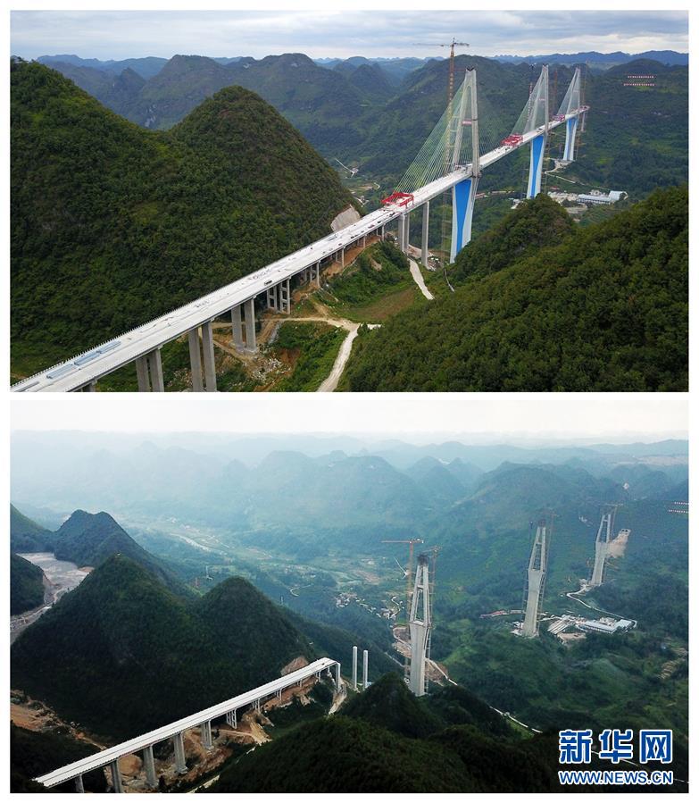 拼版照片:上圖為2019年9月20日無(wú)人機(jī)拍攝的平塘特大橋;下圖為2018年9月25日拍攝的平塘特大橋。新華社記者楊文斌攝