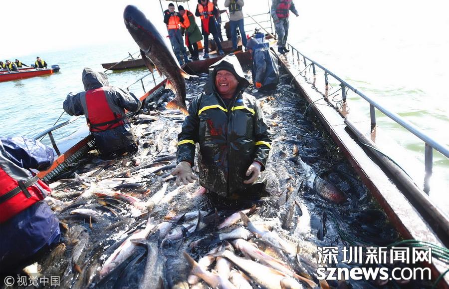 在河南省洛陽(yáng)市嵩縣,第三屆陸渾開漁節(jié)啟幕,捕撈隊(duì)員們?cè)诤牧阆率畮锥鹊臏囟认麻_始捕魚,收獲新年“第一網(wǎng)”——超10噸魚,現(xiàn)場(chǎng)一派魚躍人歡的喜悅景象。