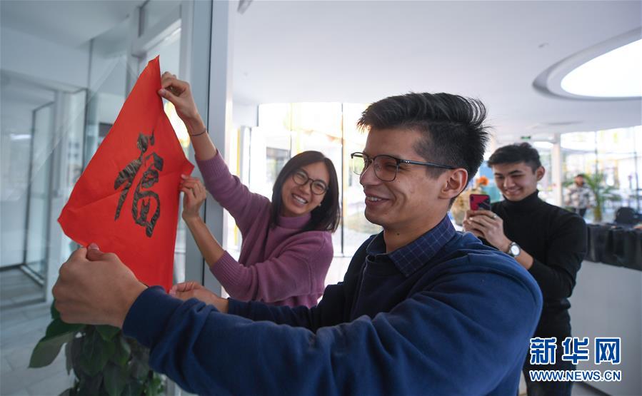 12月27日,來(lái)自俄羅斯的留學(xué)生阿布(中)在瓜山新苑社區(qū)活動(dòng)中心與中國(guó)青年一起貼福字。新華社記者 徐昱 攝