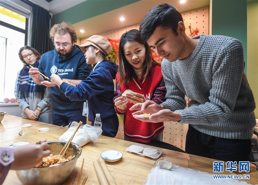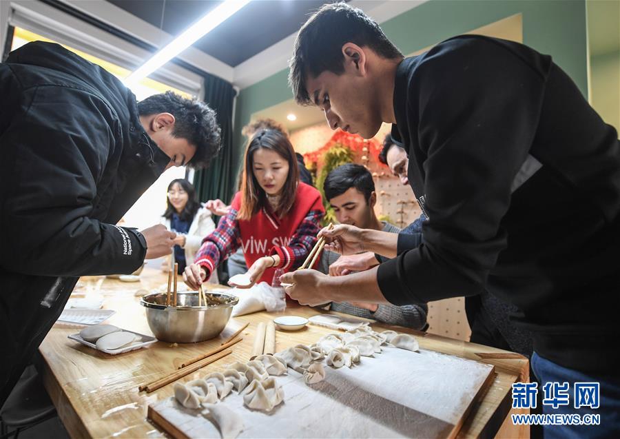 12月27日,中外青年在瓜山新苑社區(qū)活動(dòng)中心參加迎新年活動(dòng),一起包餃子。新華社記者 徐昱 攝