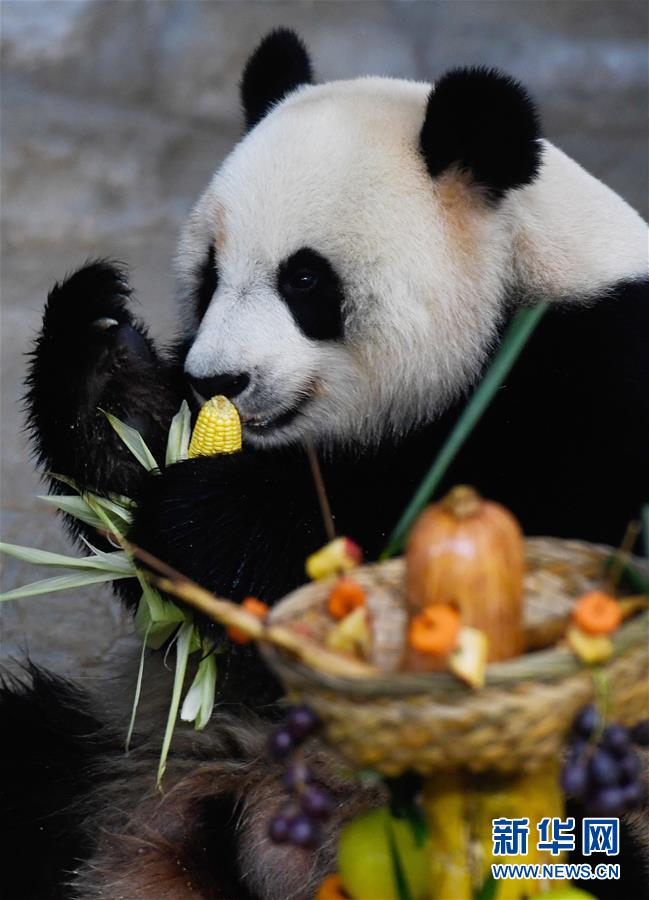12月31日,大熊貓“貢貢”在吃玉米。 新華社記者 楊冠宇 攝