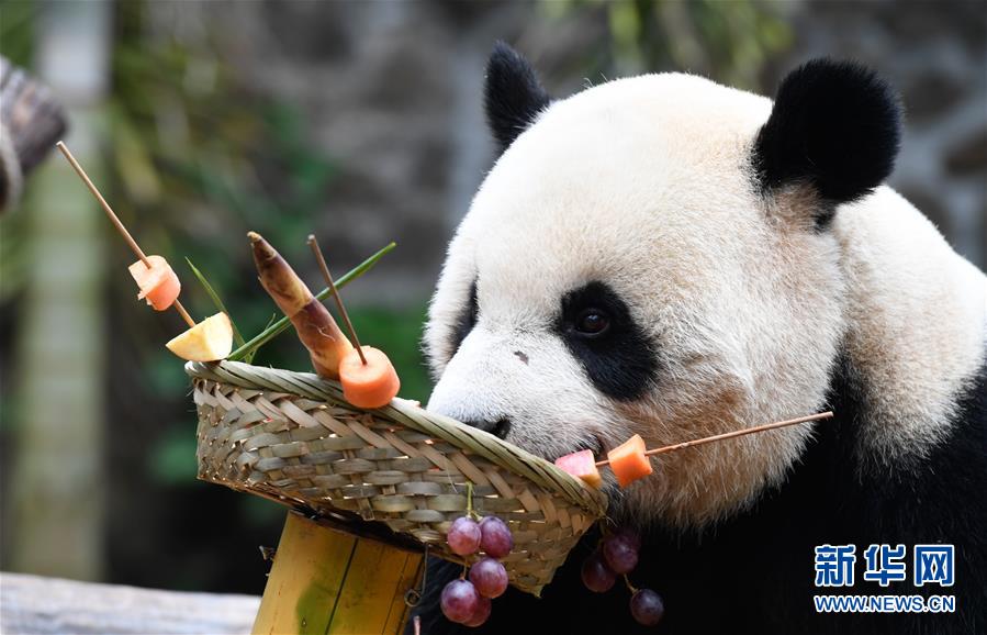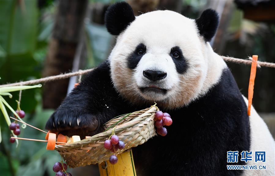 當日是2019年最后一天,海南熱帶野生動植物園的工作人員為園區(qū)內大熊貓“貢貢”“舜舜”準備了用葡萄、南瓜、竹筍等果蔬制作的“火鍋串串香”,讓它們用“擼串”的方式迎接新年的到來。 新華社記者 楊冠宇 攝