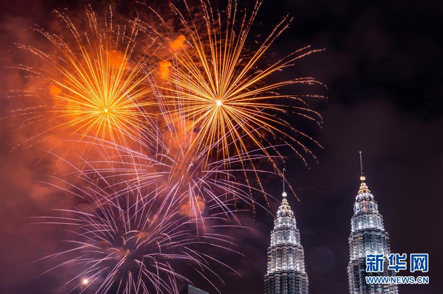 2020年1月1日,焰火在馬來西亞吉隆坡的馬來西亞國(guó)家石油公司雙塔旁綻放,迎接新年的到來。新華社記者朱煒攝