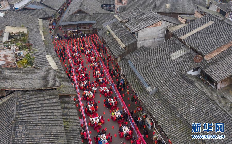 1月1日,在四川省雅安市上里古鎮(zhèn),人們在享用年豬宴(無人機(jī)照片)。新華社記者 江宏景 攝
