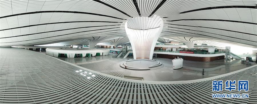 這是6月14日無人機拍攝的北京大興國際機場航站樓內(nèi)景(全景拼接照片)。新華社記者才揚攝