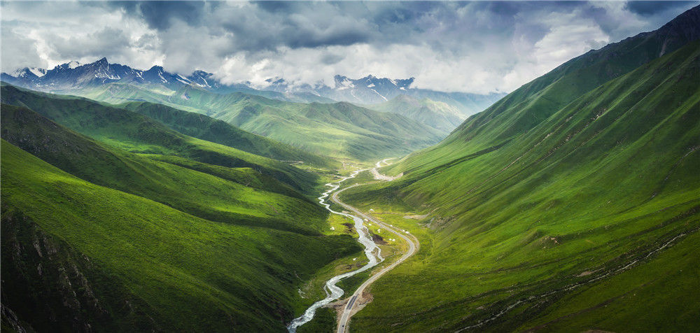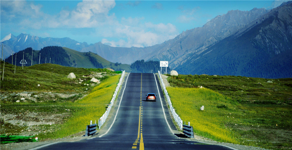 2019年7月10日,新疆獨(dú)庫公路蜿蜒在天山山脈的草原山谷中。黃光浩/視覺中國