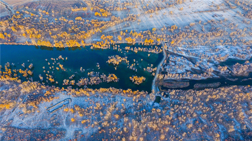 2016年11月2日,航拍的新疆塔里木河尉犁縣段胡楊林。胡熱/視覺中國