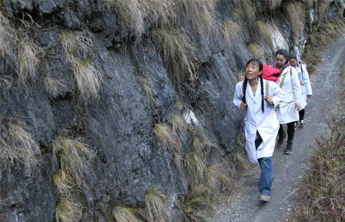 2019年1月13日,在云南省貢山縣丙中洛鎮(zhèn),管延萍(左)與同事走在進村的山路上。管延萍從經(jīng)濟發(fā)達的珠三角地區(qū),自愿到深度貧困地區(qū)云南怒江傈僳族自治州參加東西部扶貧協(xié)作,并主動申請將期限從半年延長至3年。 新華社記者張加揚攝