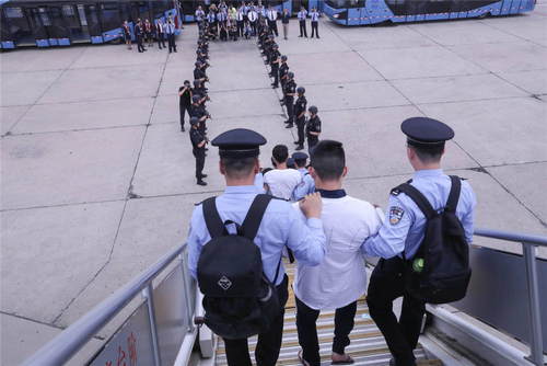2019年6月7日,在北京首都國際機場,94名冒充公檢法機關(guān)工作人員實施電信網(wǎng)絡詐騙的中國臺灣籍犯罪嫌疑人被我國公安機關(guān)從西班牙押解回國。這是我國首次從歐洲大規(guī)模押回電信網(wǎng)絡詐騙犯罪嫌疑人。新華社記者殷剛攝