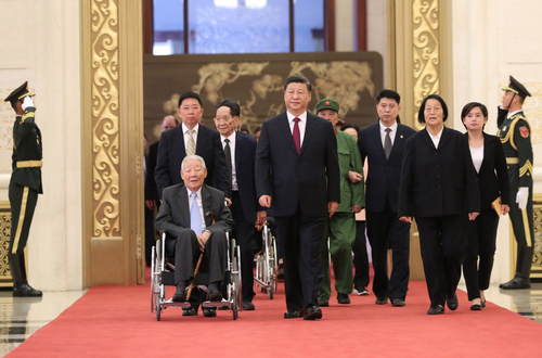 2019年9月29日,中華人民共和國國家勛章和國家榮譽稱號頒授儀式在北京人民大會堂金色大廳隆重舉行。中共中央總書記、國家主席、中央軍委主席習近平同國家勛章和國家榮譽稱號獲得者一同步入會場。新華社記者丁海濤攝