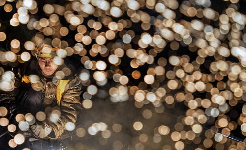 2019年1月15日凌晨,中鐵十一局施工人員在陜西省西安火車站改擴建工程現(xiàn)場切割鋼軌。新華社記者陶明攝