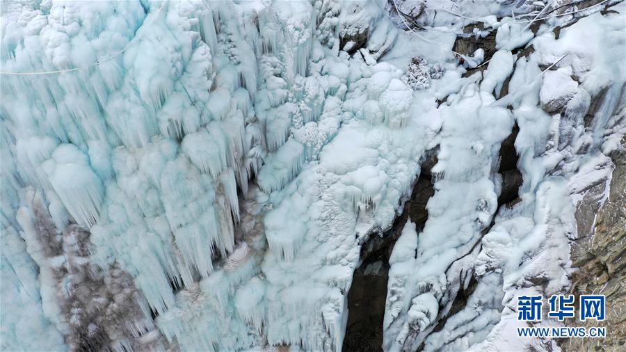 這是1月7日拍攝的賀蘭山巖畫景區(qū)內(nèi)的冰瀑景觀(無人機(jī)照片)。 新華社記者 王鵬 攝