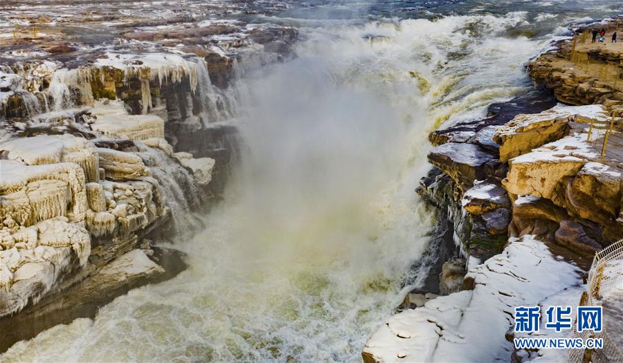 12月14日,游人在壺口瀑布景區(qū)游玩(無人機拍攝)。位于秦晉大峽谷的黃河壺口瀑布,冬日水量較夏日雖然有所減少,但驚天動地的濤聲依舊,周圍石壁上的冰掛與河中的浪濤構(gòu)成一幅獨特的北國風(fēng)光圖,吸引游客前來觀賞。新華社記者陶明攝