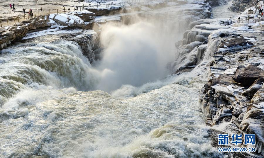 1月12日拍攝的黃河壺口瀑布的“水底冒煙”景觀(無人機(jī)照片)。新華社記者陶明攝