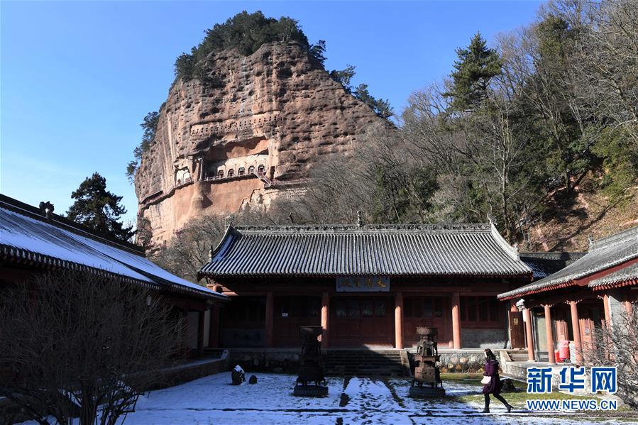 12月26日,游客在麥積山石窟參觀游覽。一場(chǎng)降雪過(guò)后,位于甘肅省天水市的麥積山石窟在晴空下尤為壯美。麥積山石窟是中國(guó)四大石窟之一,因其山形似麥垛而得名,現(xiàn)存窟龕221座。新華社記者馬寧攝