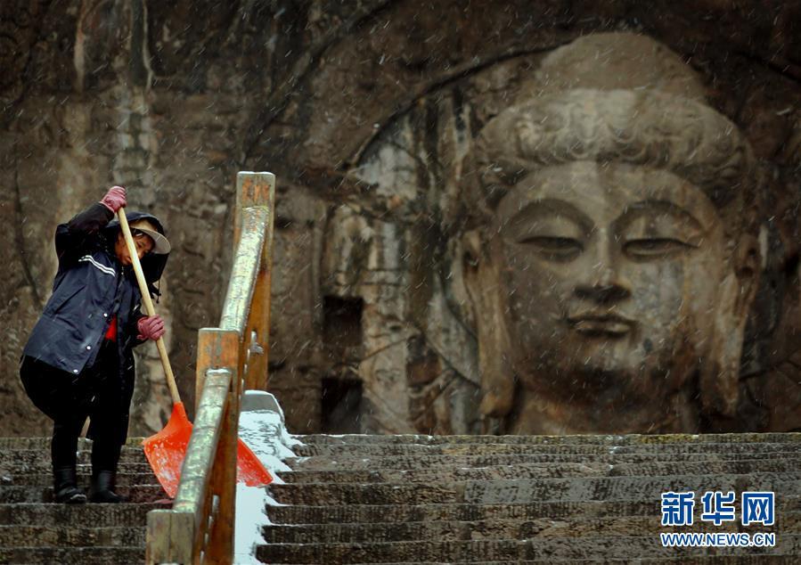 1月9日,清潔工在洛陽(yáng)龍門(mén)石窟景區(qū)內(nèi)的盧舍那大佛前清掃積雪。新華社記者李安攝