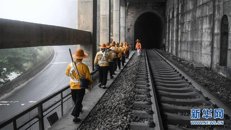 1月14日,百色工務(wù)段白水河橋隧工區(qū)班組成員開展巡查工作。在中國鐵路南寧局集團公司百色工務(wù)段白水河橋隧工區(qū),有一個由14名工人組成的班組。他們常年像“爬山虎”一樣行走攀爬在地形險峻、云霧繚繞的高山上,負(fù)責(zé)南昆鐵路轄區(qū)路段的搜山掃石工作,清除一切可能危害鐵路行車安全的因素,保障旅客出行安全。新華社記者張愛林?jǐn)z