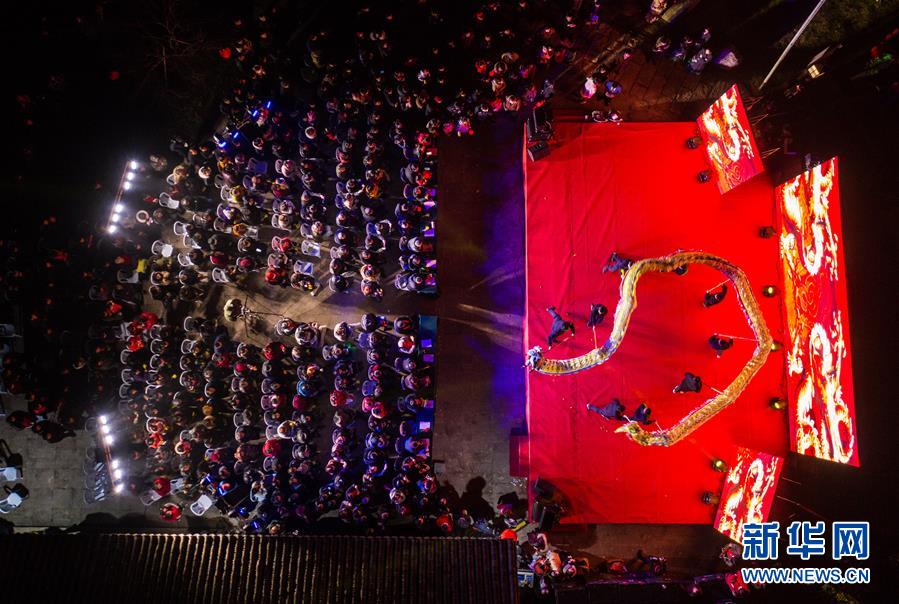 1月14日,杭州市余杭區(qū)中泰街道中橋村的文化公園內在進行“我們的村晚”舞龍表演,吸引了大批當地百姓觀看(無人機照片)。臨近春節(jié),浙江省杭州市余杭區(qū)中泰街道各村社的文化禮堂紛紛上演“我們的村晚”。老百姓自編、自導、自演為主的“土味”聯(lián)歡會因接地氣、親情濃而深受當地百姓的喜愛,成為當地鄉(xiāng)村百姓的新年迎春“文化大餐”。近年來,中泰街道以文化振興助推鄉(xiāng)村振興。目前,中泰街道下屬各村陸續(xù)建成文化禮堂7個、社區(qū)文化家園2個,努力培育和挖掘出一批鄉(xiāng)土文化人才及原創(chuàng)作品,2019年全年開展各類鄉(xiāng)村社區(qū)惠民文體活動累計180余場次。新華社記者徐昱攝