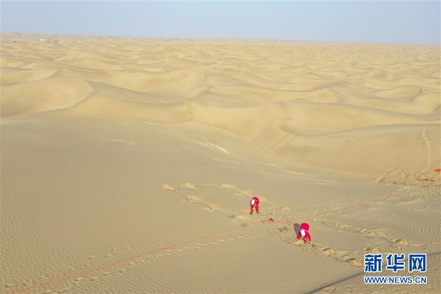 放線女工在塔克拉瑪干沙漠腹地進(jìn)行放線工作(無(wú)人機(jī)照片,1月14日攝)。