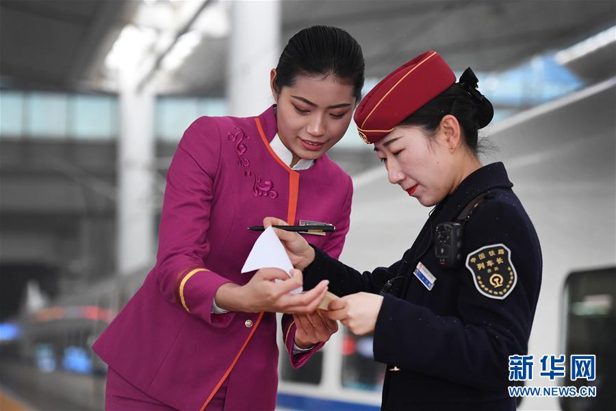 吉如(左)將盲人旅客吳瀟護(hù)送上車(chē)后,與列車(chē)長(zhǎng)進(jìn)行交接(1月15日攝)。新華社記者陶明攝