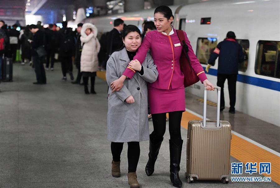 吉如(前右)護送盲人姑娘吳瀟上車(1月15日攝)。新華社記者陶明攝