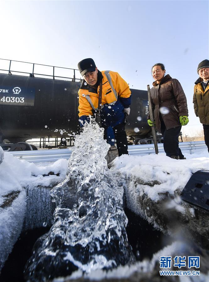 送水員黃衛(wèi)東調整輸水管位置,將水注入火炬溝乘降點的蓄水井內(nèi)(1月17日攝)。新華社記者許暢攝