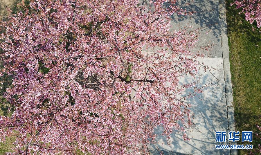 這是2月24日在上海松江辰山植物園內(nèi)拍攝的河津櫻(無人機(jī)照片)。 新華社記者 方喆 攝
