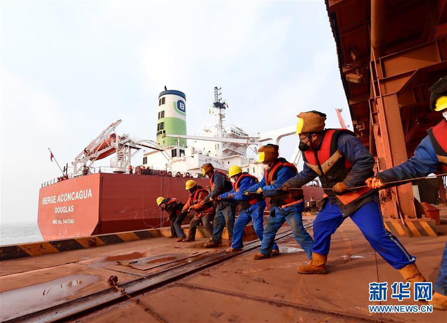 2月24日,在曹妃甸港區(qū)礦石碼頭,工人在為一艘靠岸的40萬噸級輪船拴掛纜繩。 連日來,河北省唐山港曹妃甸港區(qū)為有效防控疫情、保證安全生產(chǎn),采取對進入港區(qū)人員檢測體溫、對車輛進行消殺等嚴格措施,為海、陸交通暢通和物資運輸提供保障。 新華社記者 楊世堯 攝