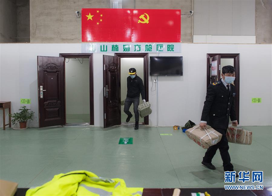 2月25日,在青山楠姆方艙醫(yī)院,工作人員在現(xiàn)場忙碌。 新華社記者 肖藝九 攝