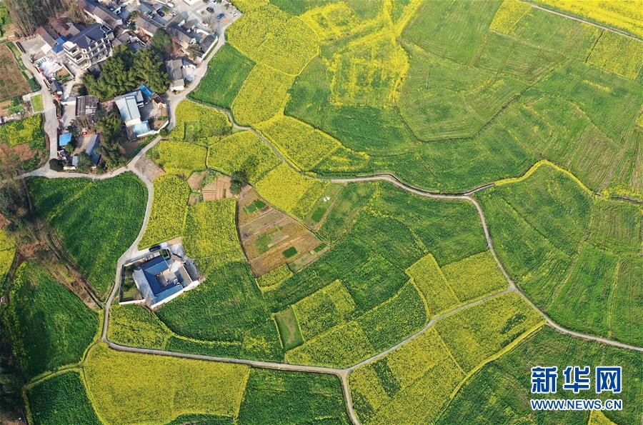 2月25日在四川省崇州市農業(yè)產業(yè)功能區(qū)拍攝的油菜花田(無人機照片)。初春時節(jié),正值農時。成都平原西部的大邑、崇州等縣市油菜長勢良好,一片生機盎然的景象。新華社記者王曦攝