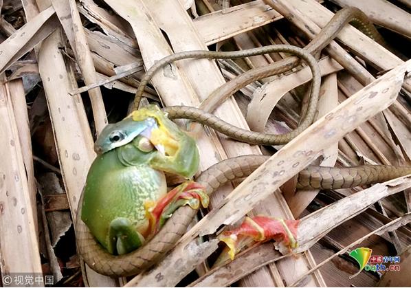 印度喀拉拉邦,一條大眼樹蛇非常貪婪地一口吞下了一只長約10厘米的青蛙,只剩青蛙兩只腿在外掙扎。28歲的捕蛇人Sujith VP拍下這一過程。