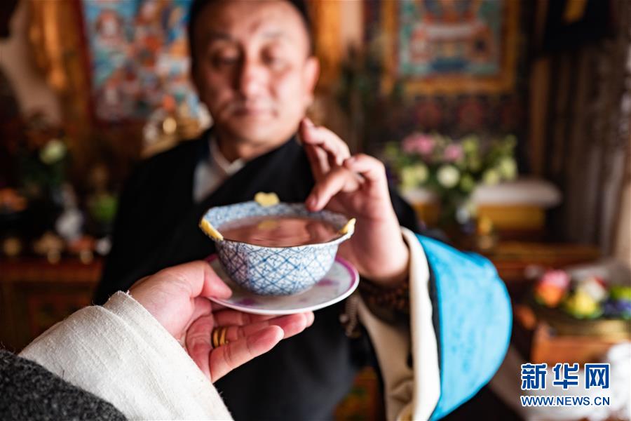 一名拉薩市民在進(jìn)行品嘗青稞酒前的儀式(2月24日攝)。新華社記者普布扎西攝