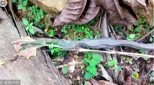 2018年7月18日,廣東東莞,藍(lán)綠鵲與蛇的地盤(pán)爭(zhēng)斗。