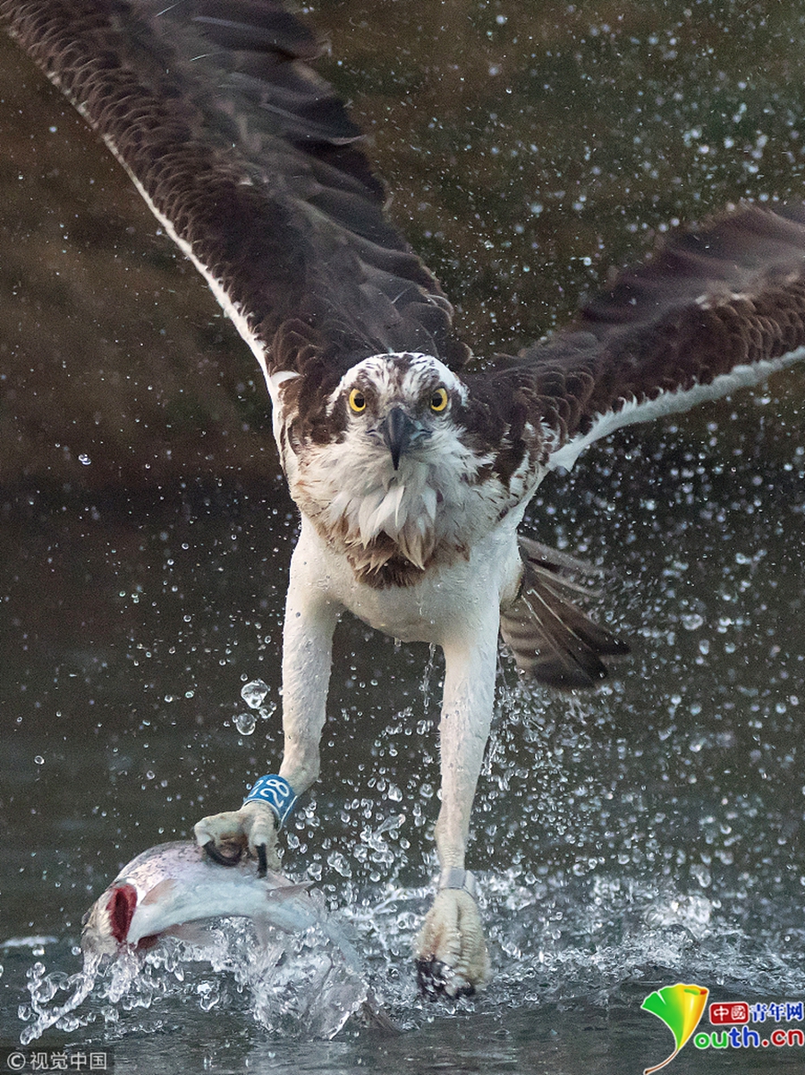 魚鷹潛入湖中捉鱒魚