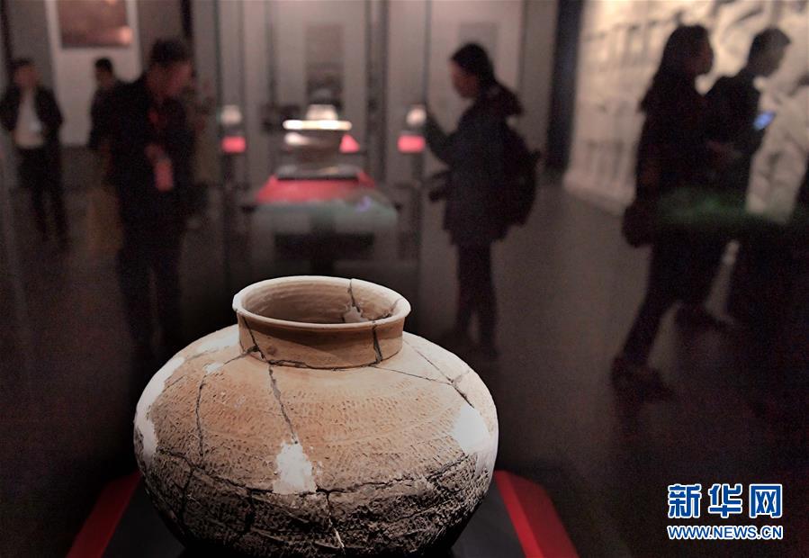 參觀者在二里頭夏都遺址博物館觀看展出的陶器(2019年10月19日攝)。新華社記者李安攝