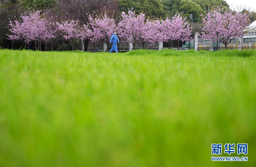 3月3日,一名工作人員從盛開的櫻花樹下走過。 新華社記者 費(fèi)茂華 攝