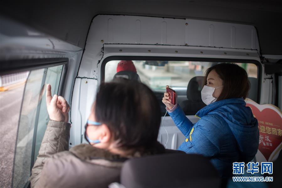 3月12日,黎婧(右)被小區(qū)工作人員接上車后,透過車窗拍攝熟悉的街道。 3月12日,插畫師黎婧和84位病友離開自己居住的武漢軟件工程職業(yè)學院康復驛站,回到自己家中。他們都是治愈出院的新冠病毒肺炎患者,已經在武漢軟件工程職業(yè)學院康復驛站進行了14天醫(yī)學觀察,達到醫(yī)學標準,成功解除隔離。他們由專車運送至所屬社區(qū)附近的集散點后,在社區(qū)工作人員的陪同下回家。 新華社記者 肖藝九 攝