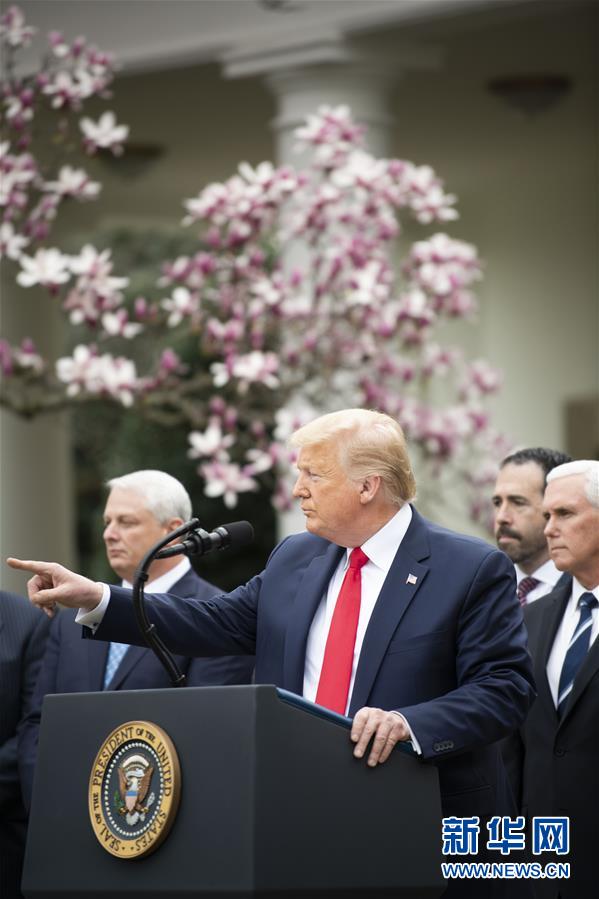 3月13日,美國總統(tǒng)特朗普(前)在華盛頓白宮的記者會上講話。特朗普當天下午在白宮發(fā)表講話時正式宣布“國家緊急狀態(tài)”。他說,此舉旨在讓美國聯(lián)邦政府全力投入到抗擊新冠肺炎疫情的努力中。這項舉措將釋放500億美元資金,幫助各州和地方政府應對疫情。新華社記者劉杰攝
