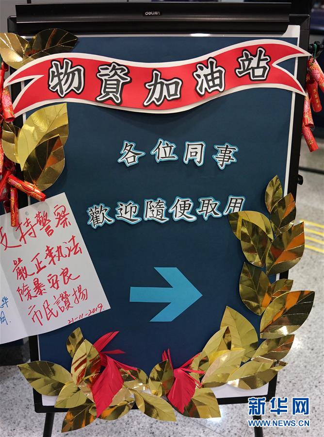 在香港西區(qū)警署一角的物資加油站標(biāo)牌上貼著市民手寫(xiě)的心意卡(1月27日拍攝)。新華社記者李鋼攝