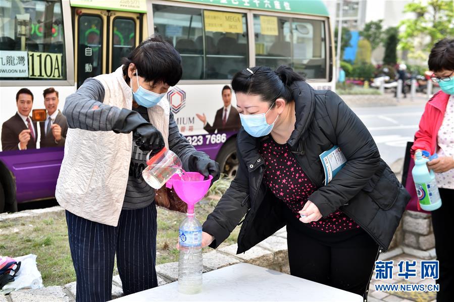 2月23日,市民領(lǐng)取消毒清潔劑。在將軍澳向市民免費(fèi)派發(fā)消毒清潔劑。當(dāng)日,香港工聯(lián)會(huì)新華社記者盧炳輝攝