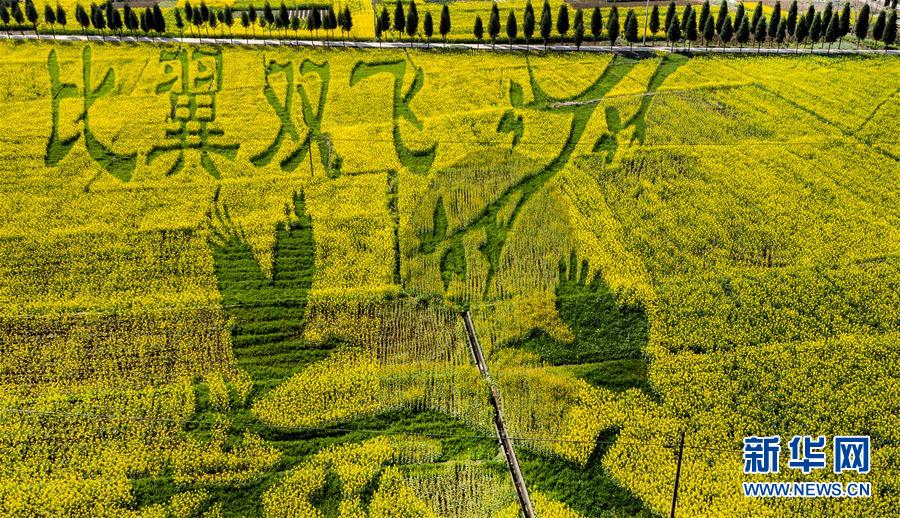 3月14日拍攝的洋縣紙坊街道龍山觀花點(diǎn)創(chuàng)意種植的“相守一生”油菜花景觀(無人機(jī)照片)。 新華社記者陶明攝