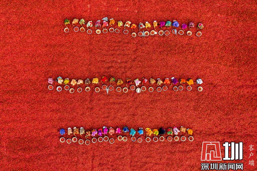 航拍孟加拉國(guó)工人分揀辣椒 滿眼火紅大地如鋪上地毯