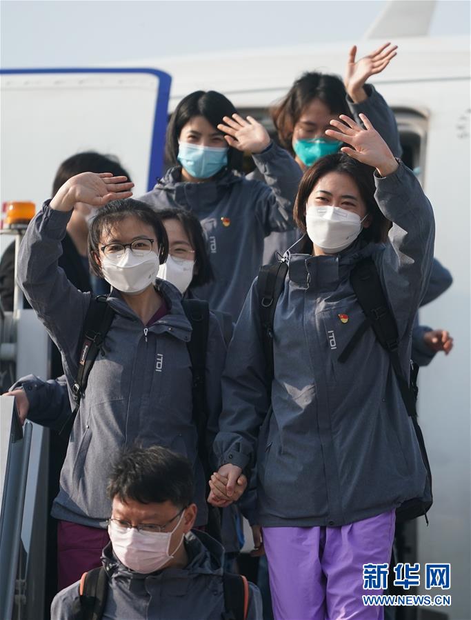 3月17日,在天津?yàn)I海國際機(jī)場,醫(yī)療隊(duì)隊(duì)員向前來接機(jī)的人們揮手致意。新華社記者李然攝