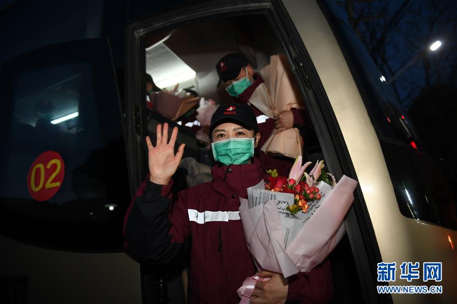 3月17日,抵達(dá)陜西西安的醫(yī)療隊(duì)隊(duì)員向前來迎接的人員揮手致意。新華社記者李一博攝
